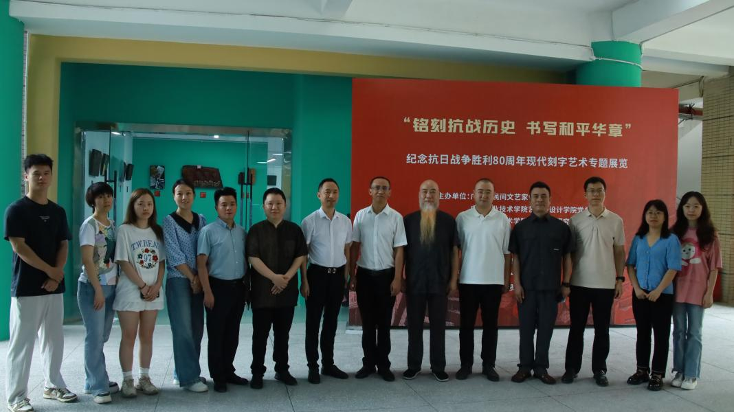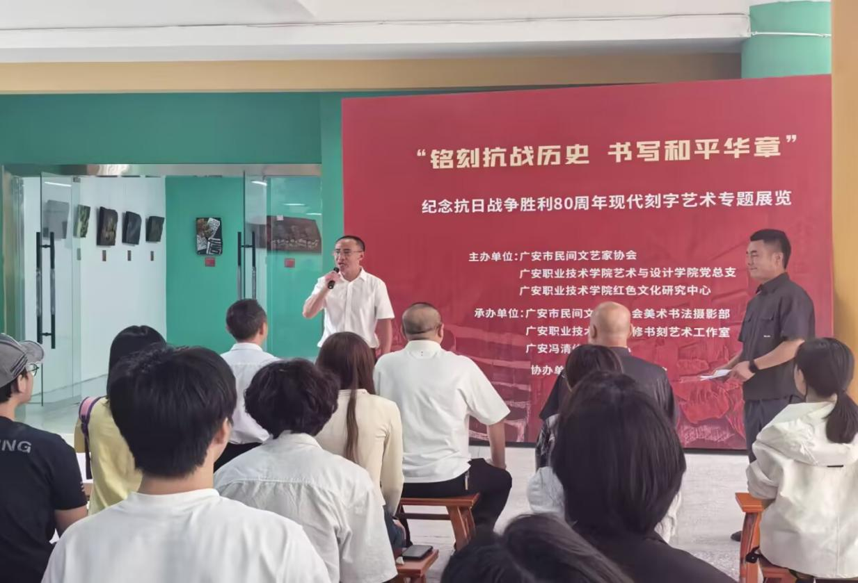6月25日上午,学校艺术与设计学院党总支、红色文化研究中心联合广安市民间文艺家协会,共同主办的“铭刻抗战历史·书写和平华章”书刻艺术作品专题展,在伟德致用楼一楼文创展厅隆重开展。本次展览旨在纪念中国人民抗日战争胜利80周年,通过独特的书刻艺术形式传承红色基因,弘扬抗战精神。