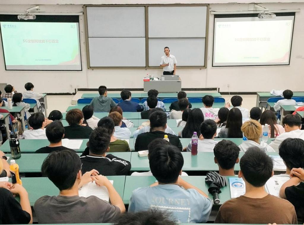 为引导学生加强专业认知学习,了解前沿技术应用,科学规划专业学习路径,9月19日下午,电信学院邀请中国电信股份有限公司广安分公司云网运营部高级工程师吴远海为2025级新生开展专业认知宣讲,宣讲主题为“5G定制网赋能千行百业”。