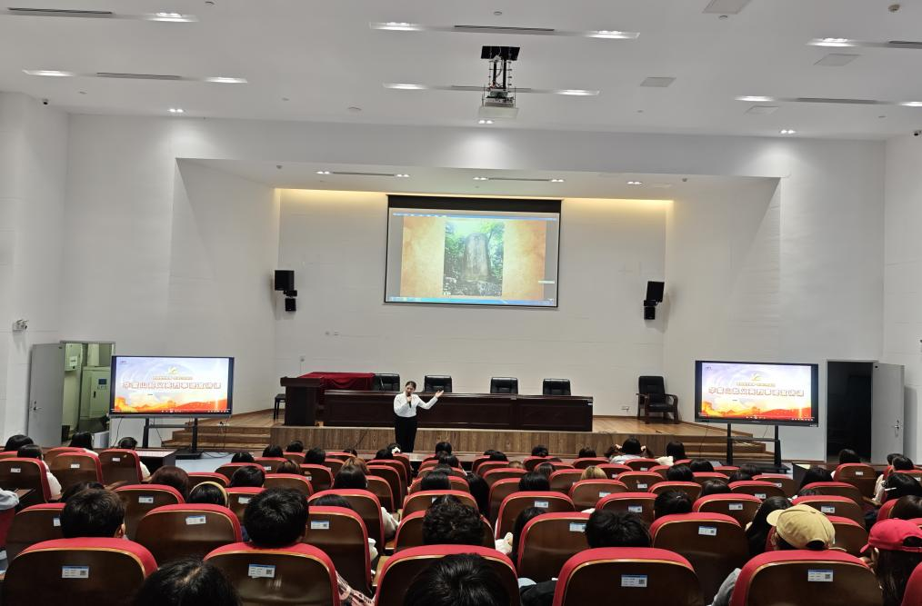 随后,到场师生在翔凤厅聆听了市博物馆讲解员主讲的华蓥山起义英烈革命事迹思政课。思政课以背景视频及故事宣讲相结合的沉浸式教学形式,讲述“广安红岩英烈故事”,深入浅出地剖析了华蓥山起义的历史背景、重大意义及其所蕴含的忠于信仰、敢于斗争、不怕牺牲的精神内核,引导学生思考如何在新时期继承和发扬革命传统,用感人事迹激励师生学习红色文化,传承红色基因。