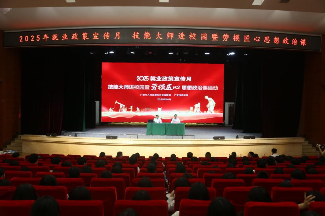 为落实就业政策宣传月部署及四川省首届技工院校校园文化活动周工作要求,2025年10月16日,广安市人力资源和社会保障局联合广安技师学院在杏坛共同举办以“技能强心 报国有我”为主题的技能大师进校园暨劳模匠心思想政治课活动,为培育高素质技术技能人才注入精神动力。