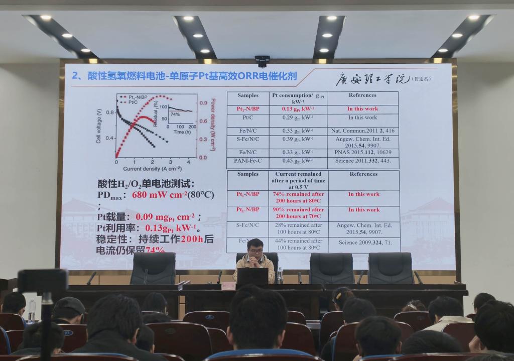 报告会上,刘京系统介绍了电催化材料在新能源器件中的关键作用与研究进展,重点围绕燃料电池、水电解及锌空气电池等方向,阐述了高性能、低成本的氧还原反应与析氢反应电催化剂的设计策略与催化机制。