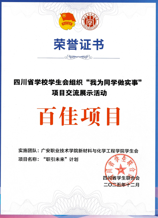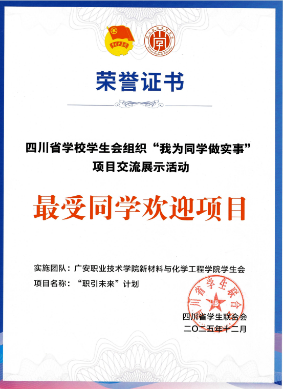12月14日至15日,由共青团四川省委、四川省学生联合会主办,西南石油大学团委、成都市学生联合会承办的2025年四川省学校学生会组织“我为同学做实事”项目交流展示活动在西南石油大学(新都校区)顺利举办。材化学院学生会牵头实施的“职引未来”计划项目获评“百佳项目”“最受同学欢迎项目”两项荣誉。