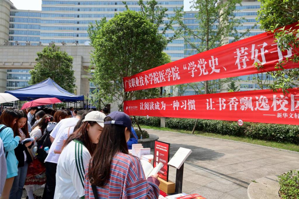 活动当日,医学院党总支和新华文轩广安分公司在医学院李时珍广场设置图书阅览选购台,提供涵盖党史学习、医学教育、中外名著、资格考试等方面书籍1000余册,师生纷纷驻足阅览选购。
