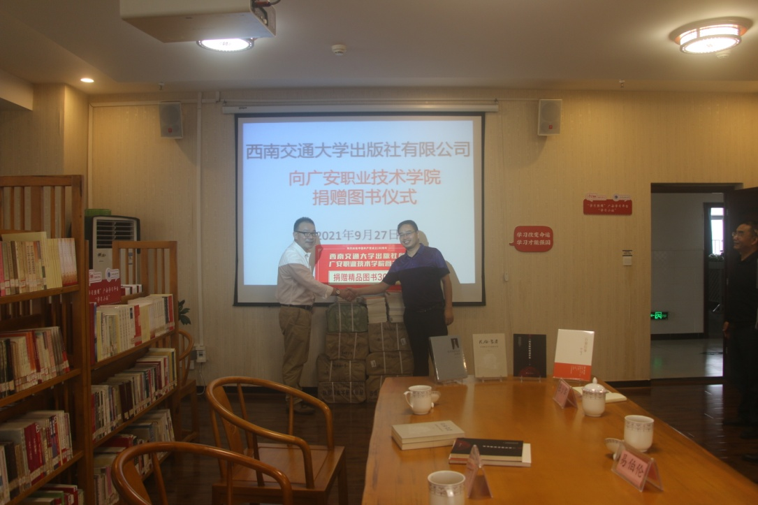 9月27日,西南交通大学出版社有限公司副社长易伯伦一行4人到伟德进行图书捐赠活动,学校党委委员、副校长邓廷奎出席捐赠仪式。