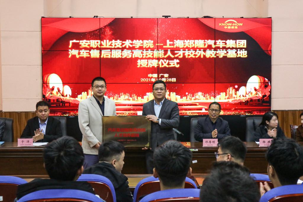 10月28日,智能学院院与中德诺浩(北京)教育科技股份有限公司、上海郑隆汽车(集团)有限公司在学校紫金厅成功举行校企合作三方合作备忘录签约仪式暨校外教学实训基地授牌仪式。学院院长李俊泓、党总支书邓厚明,国际交流与合作处、国际教育学院副院长甘胡委,上海郑隆汽车(集团)有限公司总监陈翀、党支部书记杨瑛,中德诺浩经理胡文霞及汽车专业部分教师参加了仪式。