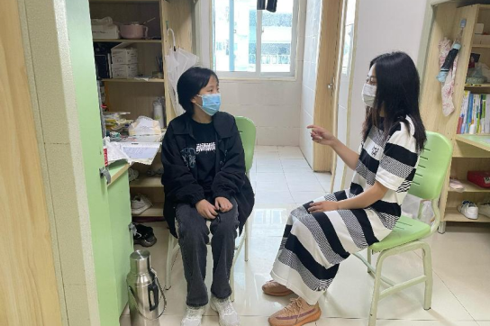 ▲学院教师对心理压力较大学生进行一对一疏导