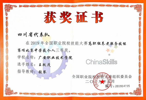 王跃茂,男,22岁,中共党员,四川自贡人,医学院老年服务与管理专业2020届毕业生,在校期间担任医学院学生会主席,曾获得2019年全国职业院校技能大赛高职组养老服务技能大赛三等奖,四川省优秀毕业生,四川省综合素质A级证书,四川省创新创业方法与应用二等奖(团队),校级励志奖学金等多项荣誉,现就职于成都亲睦家学苑医养中心。2019年12月进入学苑医养中心实习,实习期间踏踏实实,勤勤恳恳,善于学习新的养老护理技术,得到单位领导的高度认可和一致好评。最终以优异的表现完成实习学习。2020年6月毕业后通过层层面试及综合考核,成功应聘亲睦家学苑医养中心楼层介护组长一职。在职期间,他带领楼层3名工作人员,负责老人的饮食起居,陪老人说话聊天,做游戏,陪做身体检查和手工等,为老人提供了专业的照料,也让老人老有所依,老有所伴,不再孤独,得到了中心老人的充分肯定。由于个人较强的管理水平,2021年6月被选为中心介护大组长,负责本中心老年人生活照料操作规程、护理等级的要求,并对20余名养护工作人员进行对老人的健康娱乐、生活照料、等工作技能进行培训与督导。他初心不改,满腔热忱,表示会一直从事养老服务行业,书写养老护理的新篇章。