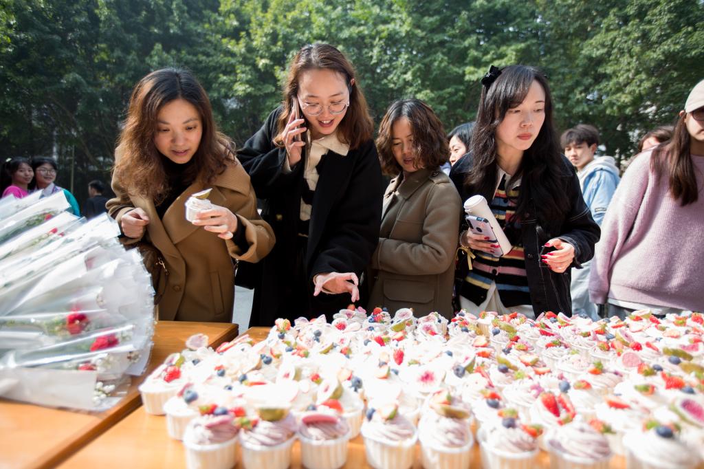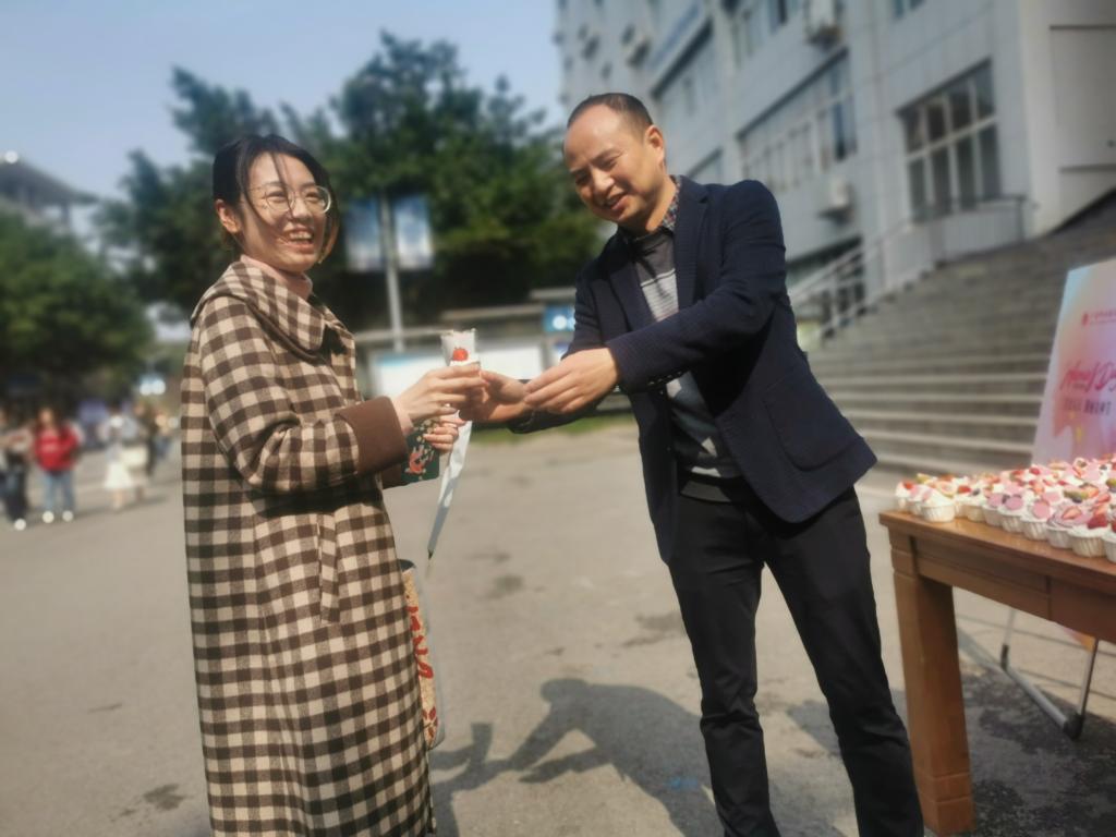 在教工餐厅入口处,后勤管理处精心准备了纸杯蛋糕和鲜花,党委委员、副校长罗龙海为到场女教职工赠送鲜花和糕点,并送上节日祝福。带着一份感动和愉悦,女教职工们纷纷领取和品尝属于她们的专属礼物,现场气氛热烈、浓郁、温馨。