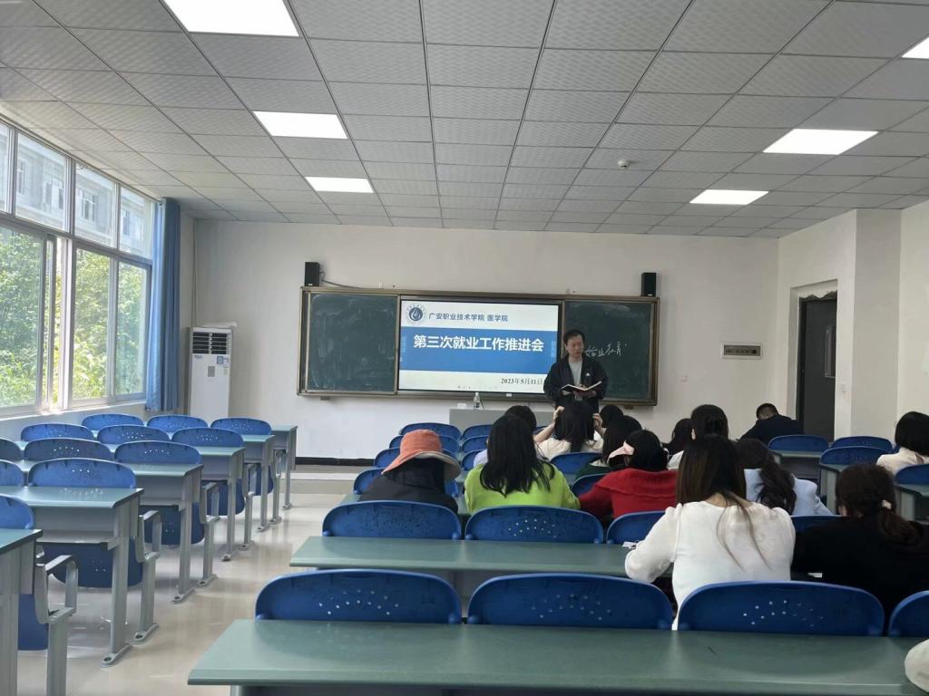 为深入推进医学院2023届毕业生就业工作,促进毕业生更充分更高质量就业。5月11日中午,医学院在崇贤楼109教室组织召开2023届毕业生就业工作第三次推进会议,医学院副院长贺洪军、招生就业办公室主任赵婧羽、干事龚春平及全体毕业班班导师参加会议,会议由医学院党总支书记喻忠主持。