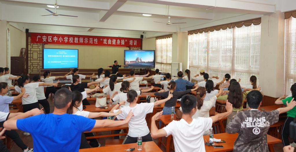 5月27日—29日,在广安紫金书院举行了为期3天的广安区中小学校教师示范性“戏曲健身操”培训,来自广安区各公办中小学校的53名教师参训。本次活动由广安区教育科技和体育局、广安市民间文艺家协会联合主办,广安紫金书院承办。活动主题为“繁荣民族民间文化 助力曲艺名城建设”,旨在推动民间曲艺事业的蓬勃发展,助推广安建设“中国曲艺名城”。