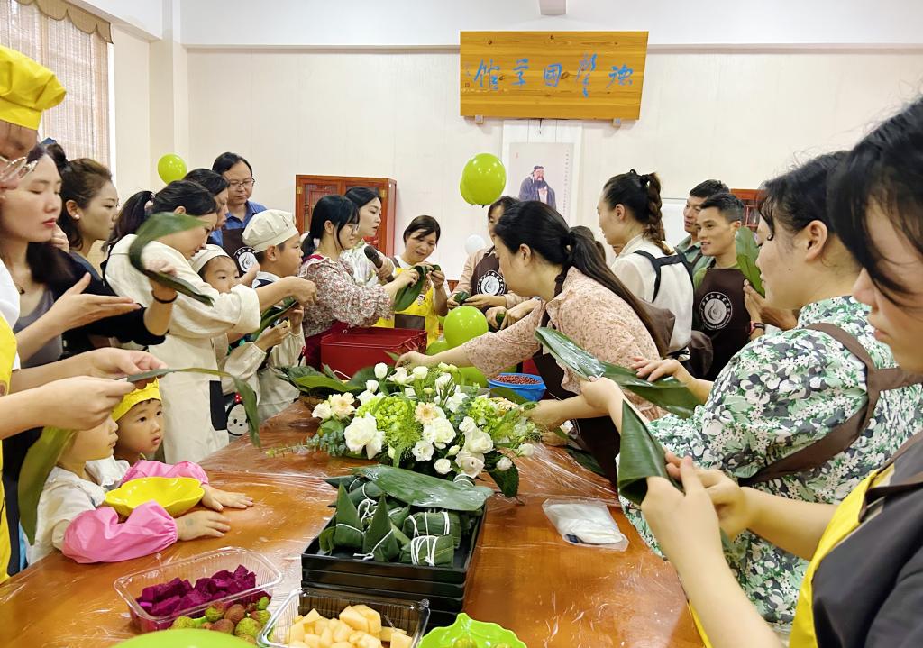 活动设“亲子荟”家庭美食比拼和玩转“粽”艺两个环节。家庭美食比拼环节,各家庭自备食材、厨具,现场操作备菜,视频播放美食烩制过程,孩子展示菜品并介绍菜名寓意。每组家庭头戴厨师帽身系围裙纷纷拿出看家本领,展现绝活,擀面切菜、创意摆盘,热闹非凡,孩子们就菜品营养搭配、美好寓意进行了分享,让人垂涎欲滴。