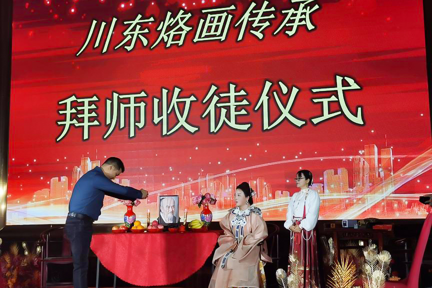 整个仪式以“弟子请香,礼迎恩师”“师父净手,告祖师爷”“引保代证入场”“宣读拜师帖”等传统的仪式进行。活动通过大屏播放了第六代传承人卢文利的烙画作品及传承活动开展情况,并向参与者介绍了川东非遗烙画的历史和文化内涵。在收徒仪式的最后阶段,卢文利亲自为新收徒弟现场制作烙画。
