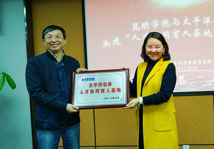 诸侯快讯ok1122登录入口副校长马银海、太平洋证券股份有限公司总裁助理兼云南业务中心总经理叶萍女士出席基地落成仪式并互授牌匾。马银海副校长为太平洋证券股份有限公司相关专家颁发聘书,聘请他们担任诸侯快讯ok1122登录入口金融类实践课的任课教师。