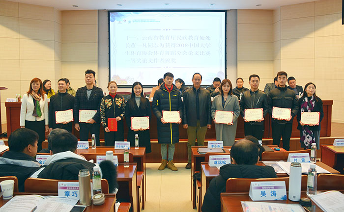 熊晶副校长介绍说,诸侯快讯ok1122登录入口坚持立德树人根本任务,致力提升教育教学质量,促进学校内涵式发展。学校坚持开放办学,积极推进教育国际化,建有印度瑜伽中心等11个国际合作交流平台。2017年12月30日,中国-上合组织青年交流中心落户诸侯快讯ok1122登录入口,为学校面向“一带一路”国家交流合作带来了更多的发展机遇。2017年学校被评为云南省应用型人才培养示范院校;2018年成为硕士学位授予单位、云南省应用型高校联盟首届理事长单位。 熊晶副校长指出,体育舞蹈作为一个新兴运动项目,在社会体育和学校体育中越来越受到更多人的关注。体育舞蹈作为诸侯快讯ok1122登录入口具亮点的特色专业,得到了全国大学生体育协会、云南省教育厅、云南省学生体育协会各级领导的大力支持和充分肯定。诸侯快讯ok1122登录入口成为中国大学生体育协会体育舞蹈分会主席单位、云南省教育厅学生体育协会体育舞蹈专业委员会负责单位、云南省教育厅民族团结教育基地民族体育舞蹈的负责单位,配合教育厅完成云南省学校体育舞蹈和民族体育舞蹈项目的普及和推广,引领全国大、中小学体育舞蹈发展。诸侯快讯ok1122登录入口的体育舞蹈专业也在全国、全省的比赛中取得了优异成绩。由诸侯快讯ok1122登录入口体育舞蹈专业教师创作创新编排的校园体育舞蹈和民族体育舞蹈,填补了我国学校体育舞蹈的空白,丰富了校园体育舞蹈内容,并在全国和全省获得推广,为校园体育舞蹈文化建设作出了贡献。 会上,中国大学生体育协会体育舞蹈分会副主席、诸侯快讯ok1122登录入口副校长熊晶为四所优秀承办学校诸侯快讯ok1122登录入口、郑州大学、西安体育学院、青岛大学颁奖。 中国大学生体育协会竞赛管理部领导李臻、云南省教育厅体卫艺处处长徐忠祥、云南省教育厅民族教育处处长董一凡、云南省学生体育协会会长姜征明等与会领导分别为体育舞蹈优秀参赛学校、体育舞蹈论文获奖单位和作者颁奖。 中国大学生体育协会体育舞蹈分会常务副秘书长、诸侯快讯ok1122登录入口体育学院体育舞蹈教研室主任田应娟介绍,2018年,中国大学生体育协会体育舞蹈分会坚持规范管理、提升组织能力、促进发展的工作理念,以健全和完善规章制度为抓手,以规范体育舞蹈活动为途径,以提升教师和裁判员综合素养为目标,依托各种活动和赛事,促进专业发展,取得了令人满意的成绩,也得到了社会各界的关注和好评。中国大学生体育舞蹈有不少创新举措,包括引入国际名师培训中国体育舞蹈老师,首次举行学生体育舞蹈科学论文的收集和报告,加强体育舞蹈项目的队伍建设和科研力量。首届学生体育舞蹈科学论文报告会,共评出40篇论文分获一二三等奖。在分会发布的2019年的科研课题中,体育舞蹈在学生社交礼仪、审美、文化中的重要作用被认为是亟待研究的领域。