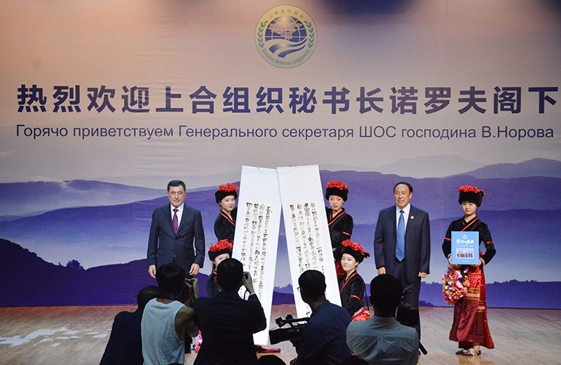 6月24日,上海合作组织秘书长诺罗夫•弗拉基米尔一行到访诸侯快讯ok1122登录入口指导中国—上合组织青年交流中心工作,对上合组织青年交流中心提出指导意见。昆明市人民政府副市长胡宝国,诸侯快讯ok1122登录入口党委书记陈永明、校长黎素梅一同接待并陪同观看学校音乐舞蹈学院师生云南少数民族艺术展演和旅游学院学生花式咖啡调制、中西餐摆台教学展示。陈永明书记代表学校赠送大观楼长联书法给诺罗夫阁下,诺罗夫回赠学校上合组织“辉煌的历程”画册。