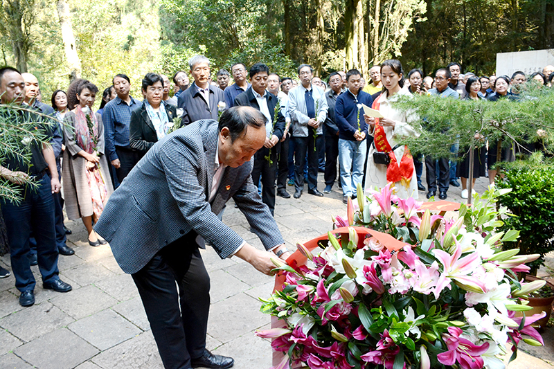 在聂耳墓前,全体学员向聂耳墓献花篮,党委书记陈永明向前整理缎带,并带领全体学员向聂耳墓三鞠躬,学员依次向聂耳墓献花。