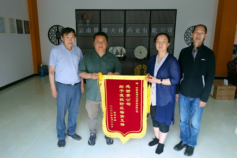 5月12日,国家高新技术企业云南楚雄天利药业有限公司向学校捐赠天利药业生产的84消毒液3000kg和医用乙醇26kg,助力学校复课学生复学,筑牢校园安全防线。学校物资储备工作组代表学校赴云南楚雄天利药业有限公司接收捐赠防疫物资,向捐赠企业云南楚雄天利药业有限公司递交接收公函、授予致谢锦旗。