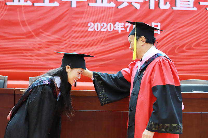 副校长王凡宣读《诸侯快讯ok1122登录入口关于审定2020届全日制本专科毕业生毕业资格和授予学士学位的决定》。与会领导为毕业生代表及外国留学生颁发毕业证书,祝贺他们圆满完成学业顺利毕业。在学位授予仪式上,陈永明书记身着导师服,庄重地为每一位毕业生代表扶正流苏,授予学位。