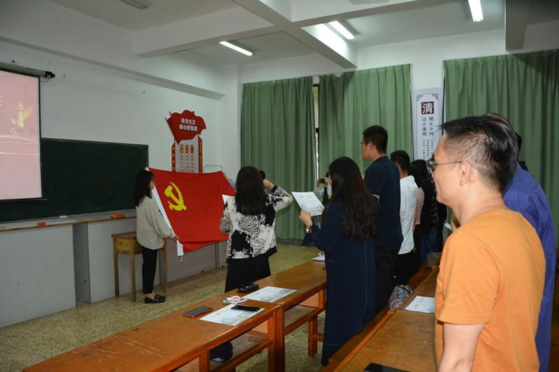 学生党员代表何官达、王瑱男同志配乐诗朗诵《星辰大海》,徐伟同志、杨洋同志分别带领全体党员奏唱《没有共产党就没有新中国》、《我和我的祖国》为中国共产党百年华诞表示祝贺。随后在学院党总支书记付晏昆同志的带领下,全体党员重温入党誓词,过集体政治生日。付晏昆书记强调中国共产党成立100周年,百年征程波澜壮阔,百年初心历久弥坚,作为一名共产党员要认真学习党史,牢记党员责任。