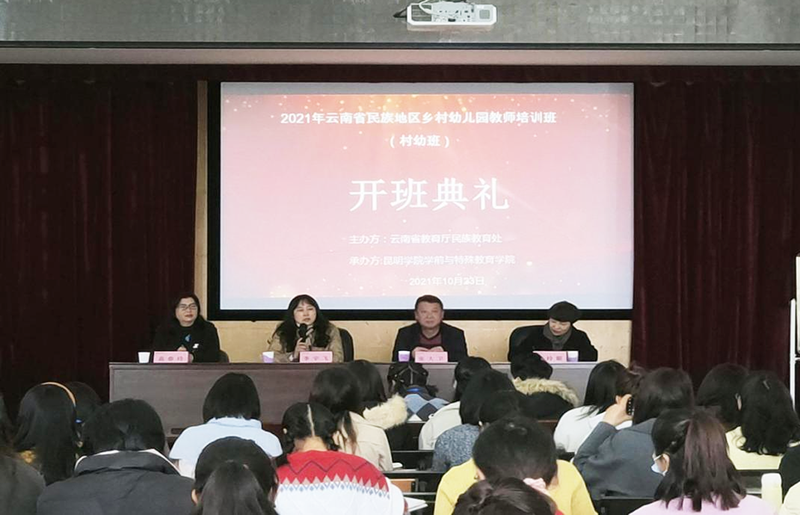 10月23日,云南省教育厅民族教育处举办的2021年度云南省民族地区乡村幼儿园教师(村幼)培训班在诸侯快讯ok1122登录入口学前与特殊教育学院举办。云南省教育厅民族教育处调研员李宇飞,学校学前与特殊教育学院书记张大卫、副院长高春玲,昆明市教工第一幼儿园园长谭玲媚副出席开班典礼。