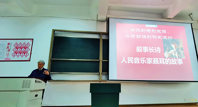 曾汝弟教授以诗朗诵的形式讲述了人民音乐家聂耳的故事、昆明红色故事,并就“聂耳为什么能在白色恐怖条件下,冒着坐大牢、掉脑袋的危险申请入团、申请入党?”“我们今天怎样学习聂耳精神?”两个问题开展了互动讨论,党员同志踊跃发言,气氛热烈。讲座形式新颖、声情并茂、感人肺腑,让师生了解聂耳参加革命的历史,共同缅怀了杰出校友,深受教育。85岁高龄的曾汝弟教授讲到对自己的要求是:“生命不息,奋斗不止,残烛还在,就要燃烧!”,这种满满的正能量深深地触动和感染了在座的师生。