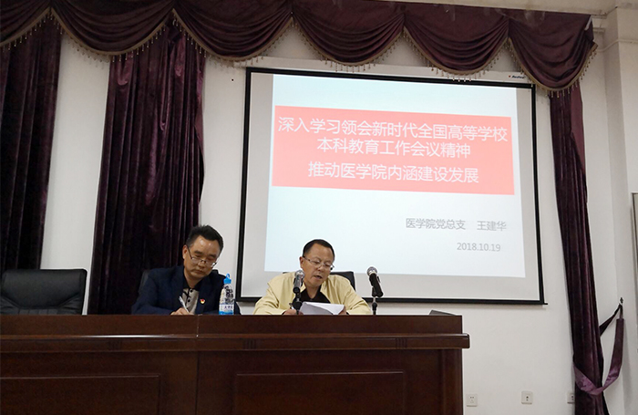 王建华书记认真传达了学校干部大会精神,带领全体教职工共同学习了《坚持以本为本,推进四个回归建设中国特色、世界水平的一流本科教育,新时代全国高等学校本科教育工作会议》及《教育部关于加快建设高水平本科教育,全面提高人才培养能力的意见》文件精神。强调,审核评估工作是全面检验和提高我院办学水平与人才培养质量的重要途径和抓手,是对医学院本科教学工作的一次全面检验。现在审核评估准备工作进入到攻坚和最后冲刺阶段,希望大家高度重视,提高认识、全员参与,严格按照学校和医学院整改方案执行,注意各项工作的时间节点,扎实推进审核评估各项工作。
