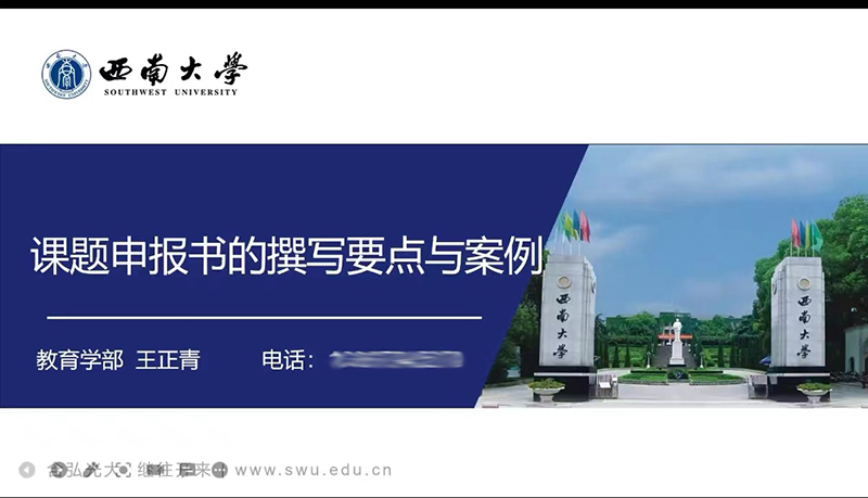 6月27日上午,西南大学教育学部副部长王正青教授通过网络会议的形式对参加“诸侯快讯ok1122登录入口高层次科研骨干研修班”的教师作了省级课题申报线上指导。本次培训为诸侯快讯ok1122登录入口高层次科研骨干研修班的第三阶段培训。学前与特殊教育学院、音乐舞蹈学院、人文学院、外语学院及数学学院的三十余位教师参加了培训。