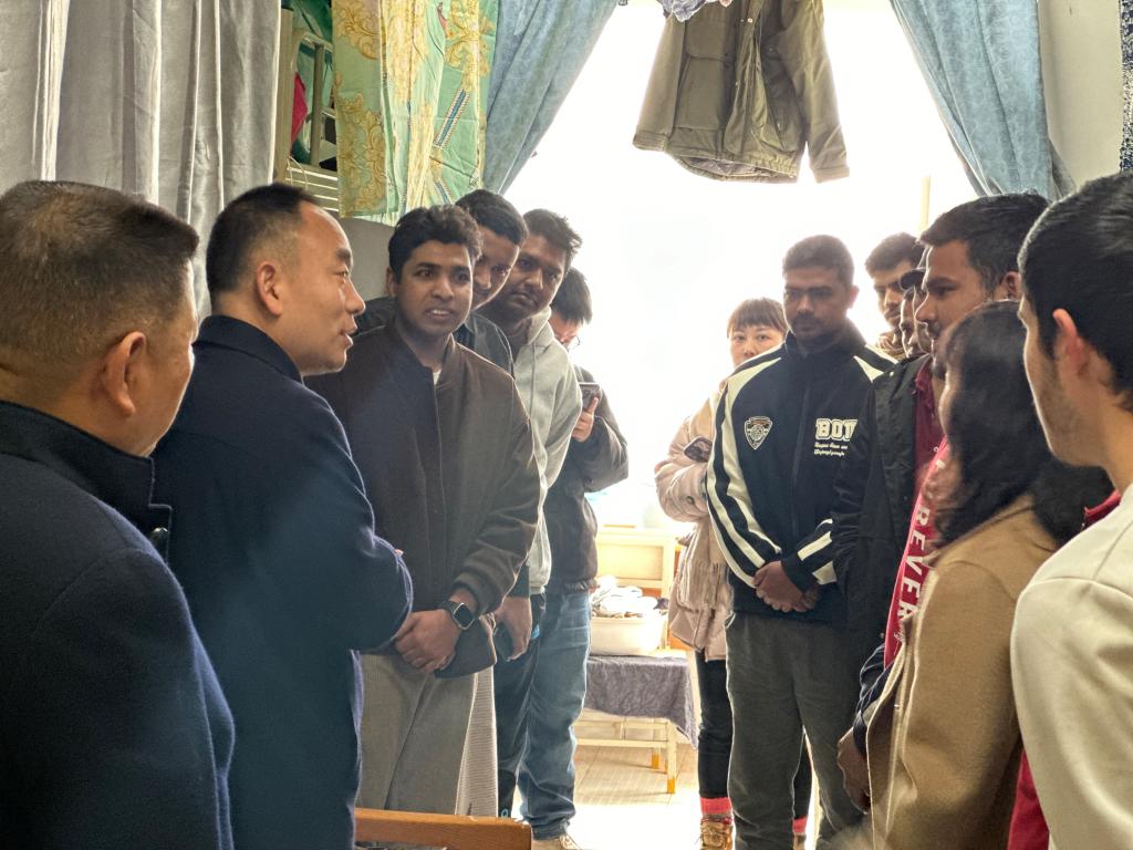 宿舍走访与座谈会期间,郭华副校长与留校学生亲切交流,详细了解了留校学生的留校原因、关心留校学习生活安排、关注返乡计划和嘱托做好安全出行安排,也向留学生们介绍了春节在中国传统文化中的重要性,代表学校向全体留校学生及学生的家人送上了新春祝福,对节前返乡的学生进行了出行安全提示。郭华副校长表示,学校全力保障留校学生的衣食住行,全方位做好服务工作,持续关心关注每一位留校学生的生活、学习情况,帮助大家解决出现的困难。也寄语每位留校学生珍惜时间,合理安排好假期留校的学习与生活,加强自我管理,注意好校内外人身财产安全,度过快乐祥和的假期。