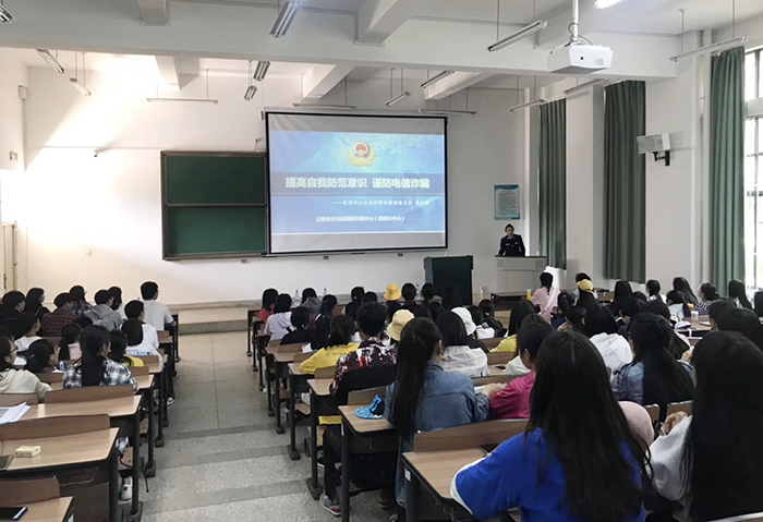 云南省反电信网络诈骗中心昆明市分中心综合办公室负责人,昆明市公安局刑事犯罪侦查支队三级警督、探长陈劲蕾警官为本次讲座主讲人,经济学院150多名同学参加了本次讲座。
