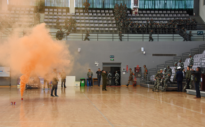 消防应急疏散演练环节,下午15时整,综合馆内突发火情,顿时“起火”位置烟雾弥漫,情况紧急。保卫人员拉响消防警报,学校立即启动消防应急预案。保卫人员通过广播发布火情预报,指挥馆内学生沿安全出口进行撤离,提示师生不要惊慌,保持冷静,服从指挥;同学们捂住口鼻、弯着腰安全有序、快速疏散到场馆外。2分钟后,所有“被困”人员安全撤离到指定区域。