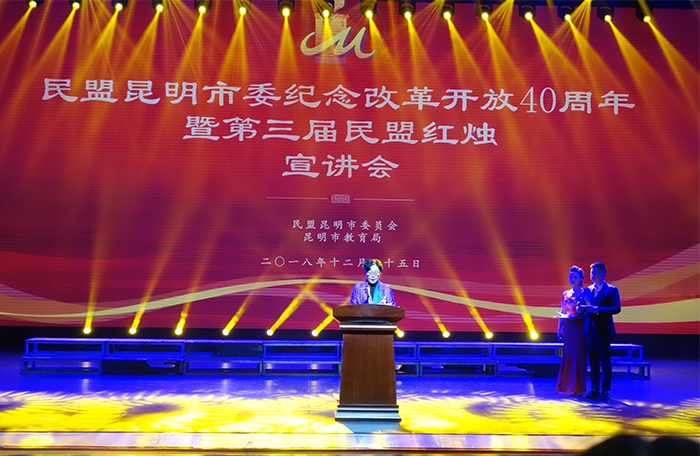 12月25日,民盟昆明市委“纪念改革开放40周年暨第三届民盟红烛宣讲会”在昆明市工人文化宫职工剧场举行。 民盟诸侯快讯ok1122登录入口总支盟员、人文学院副教授李艳峰博士荣获第三届“民盟红烛”称号。