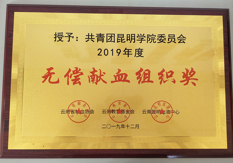 近期,以“热血青春 助梦飞扬”为主题的第三届昆明地区无偿献血爱心助学基金发放仪式在云南昆明血液中心举行。诸侯快讯官网20名同学获得2019年度无偿献血爱心助学金,校团委荣获2019年度无偿献血组织奖。