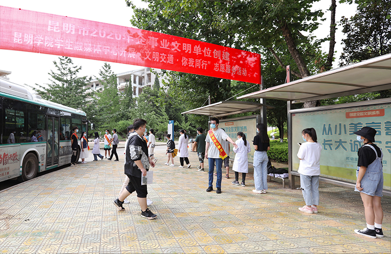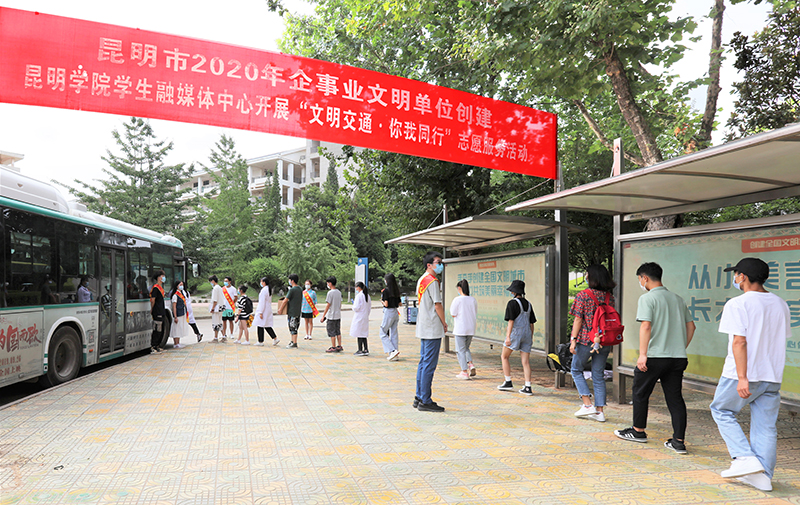 开展活动期间,学生融媒体中心的同学佩戴“青年志愿者”标识,来到学校西门公交车站,一字排开,引导同学遵守秩序、保持距离、排队乘车,劝导同学们乘车规范佩戴口罩、养成健康生活习惯。志愿者活动身影,在校园公交站台成为昆院亮丽的一道风景。