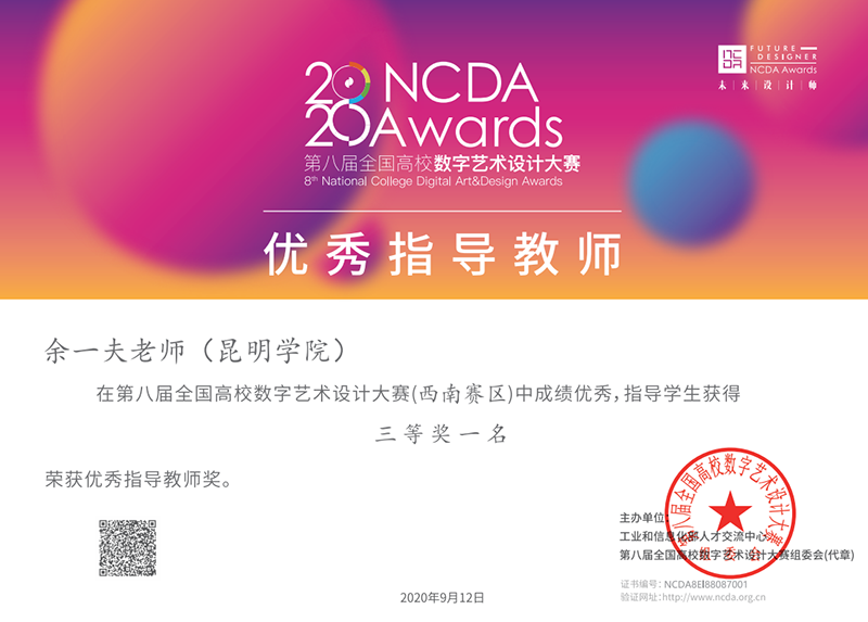 9月12日,在工业和信息化部人才交流中心主办的第八届全国高校数字艺术作品大赛(NGCA)比赛中,诸侯快讯ok1122登录入口建筑工程学院团总支书记余一夫老师荣获优秀指导教师奖,李可、朱鹏飞同学作品在“走进寻乌”命题赛中荣获西南赛区三等奖,张海滨同学在“走进耀州”命题赛中荣获西南赛区三等奖。