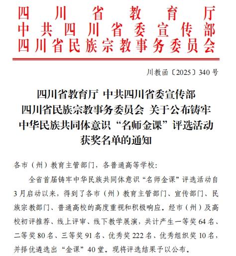 近日,省教育厅、省委宣传部、省民宗委联合公布四川省首届铸牢中华民族共同体意识“名师金课”评选活动获奖名单,