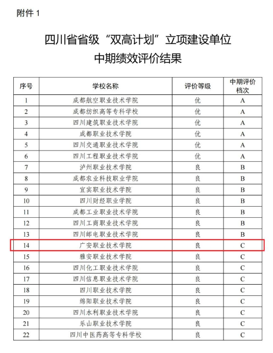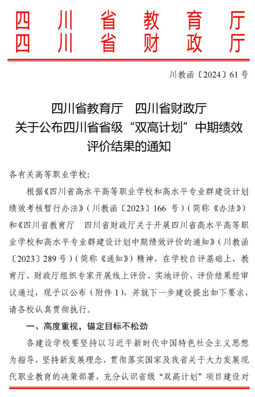 2024年1月26日,四川省教育厅 四川省财政厅发布了《关于公布四川省省级“双高计划”中期绩效评价结果的通知》(川教函〔2024〕61号),bv伟德国际1946省级“双高计划”中期绩效评价等级为“良”,排位由立项时的第20名跃升至第14名,成为C档第1,这是对学校“双高计划”建设成效的高度肯定,也彰显学校教育教学水平在实施“双高计划”建设以来正不断提升。